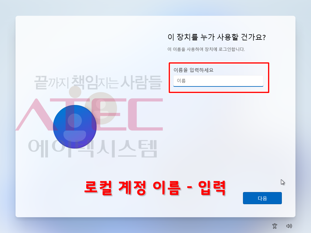 로컬 계정 이름 입력, 다음 설치 과정을 진행하면 윈도우 11 설치가 완료 된다.