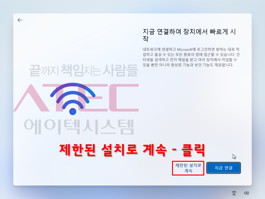 재부팅 후, 설치 과정을 진행하고 다음 화면에서 "인터넷에 연결되어 있지 않음" 클릭, "제한된 설치로 계속" 클릭