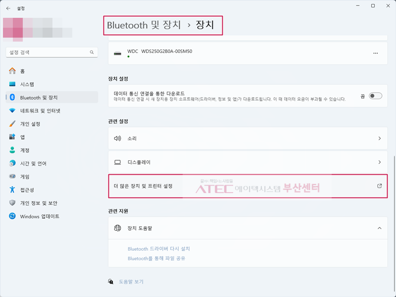 제어판 - Bluetooth 및 장치 - 장치를 선택하고 화면을 아래로 내리면