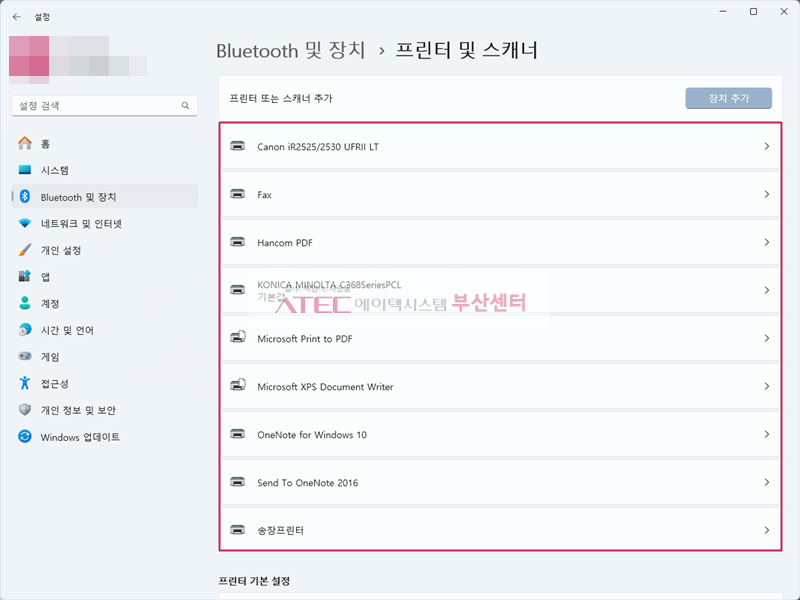 윈도우 11의 장치 및 프린터 설정 화면을 사용할 경우,