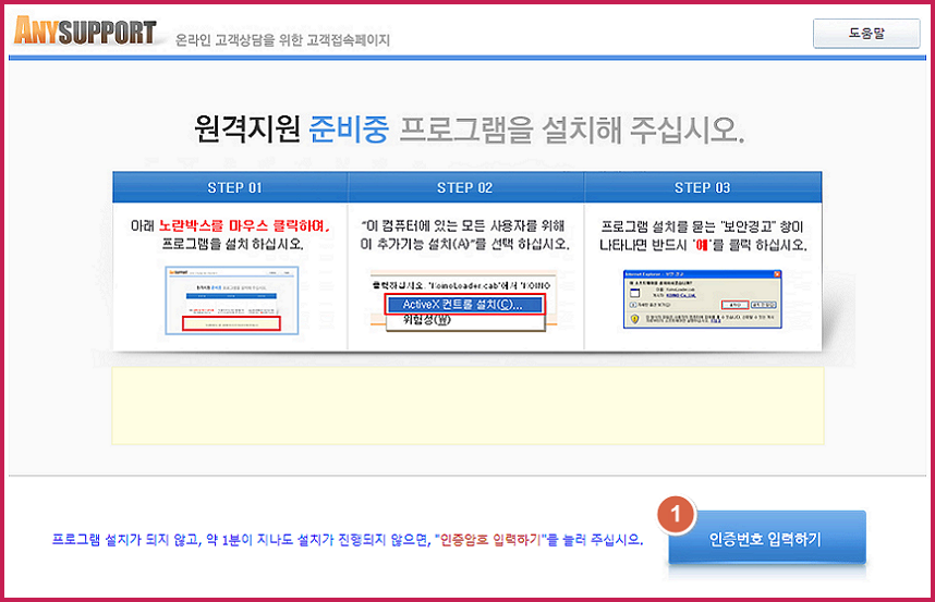 - 원격지원 준비중 페이지에서 프로그램을 설치하거나 혹은 인증번호 입력하기를 클릭.